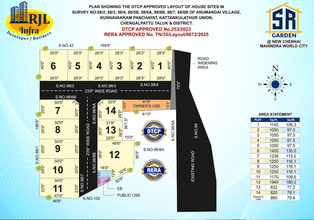 PLAN SHOWING THE DTCP APPROVED LAYOUT OF HOUSE SITES IN SURVEY NO:98/2, 98/3, 98/4, 98/5B, 98/6A, 98/6B, 98/7, 98/8B OF ANUMANDAI VILLAGE, KUNNAVAKKAM PANCHAYAT, KATTANKULATHUR UNION, CHENGALPATTU TALUK & DISTRICT.